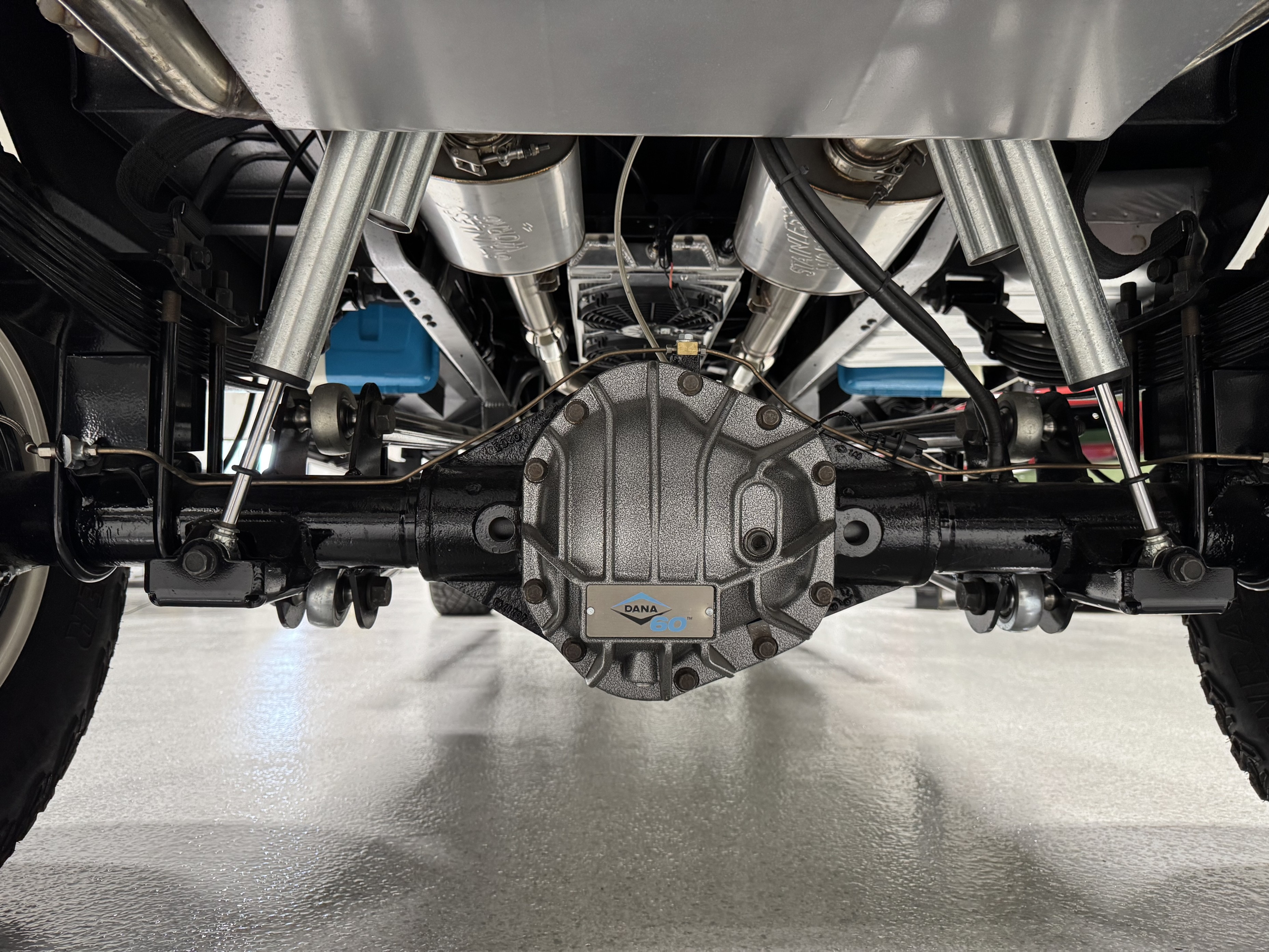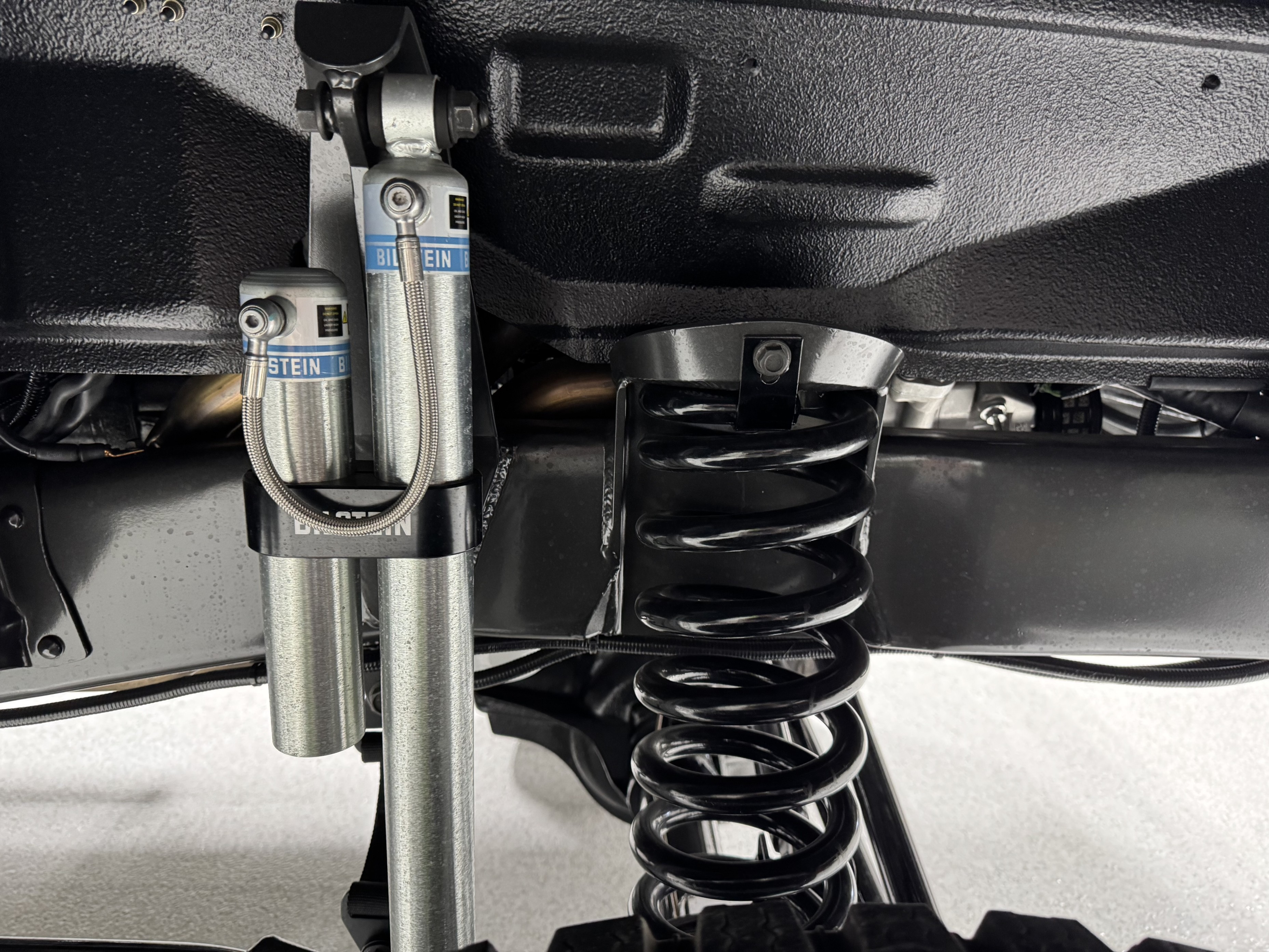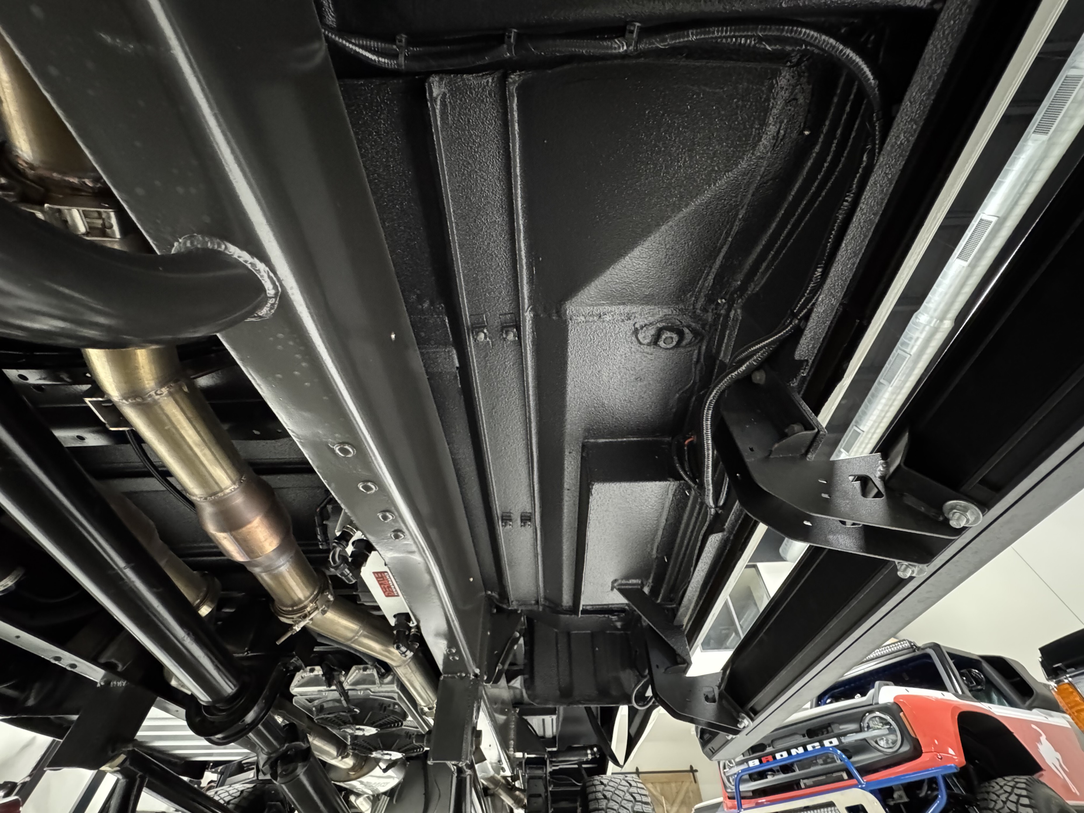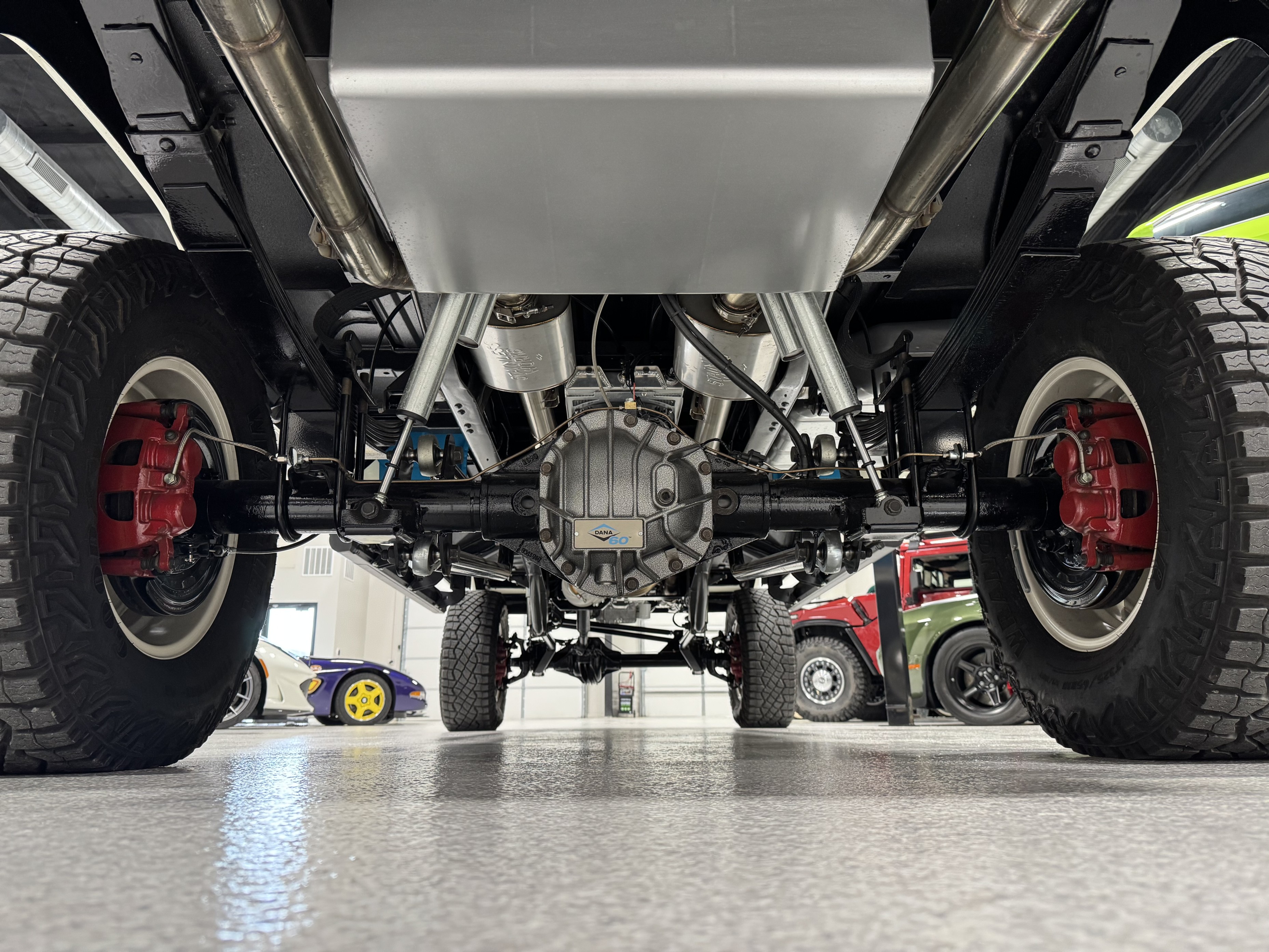 Additional features include Eaton ELocker front and rear differentials, Dana axles, power side steps, Hydroboost power brake assist, Wilwood four-wheel disc brakes, a suspension lift, Bilstein shock absorbers, a four-link rear suspension system, and Detroit Steel Wheels. Fueltech FT550 ECU, Shelby-style wood steering wheel, Dakota digital instrumentation, and a retro-style digital / bluetooth stereo. Vintage Air and power windows. This was a $402K custom build by Gateway Bronco.