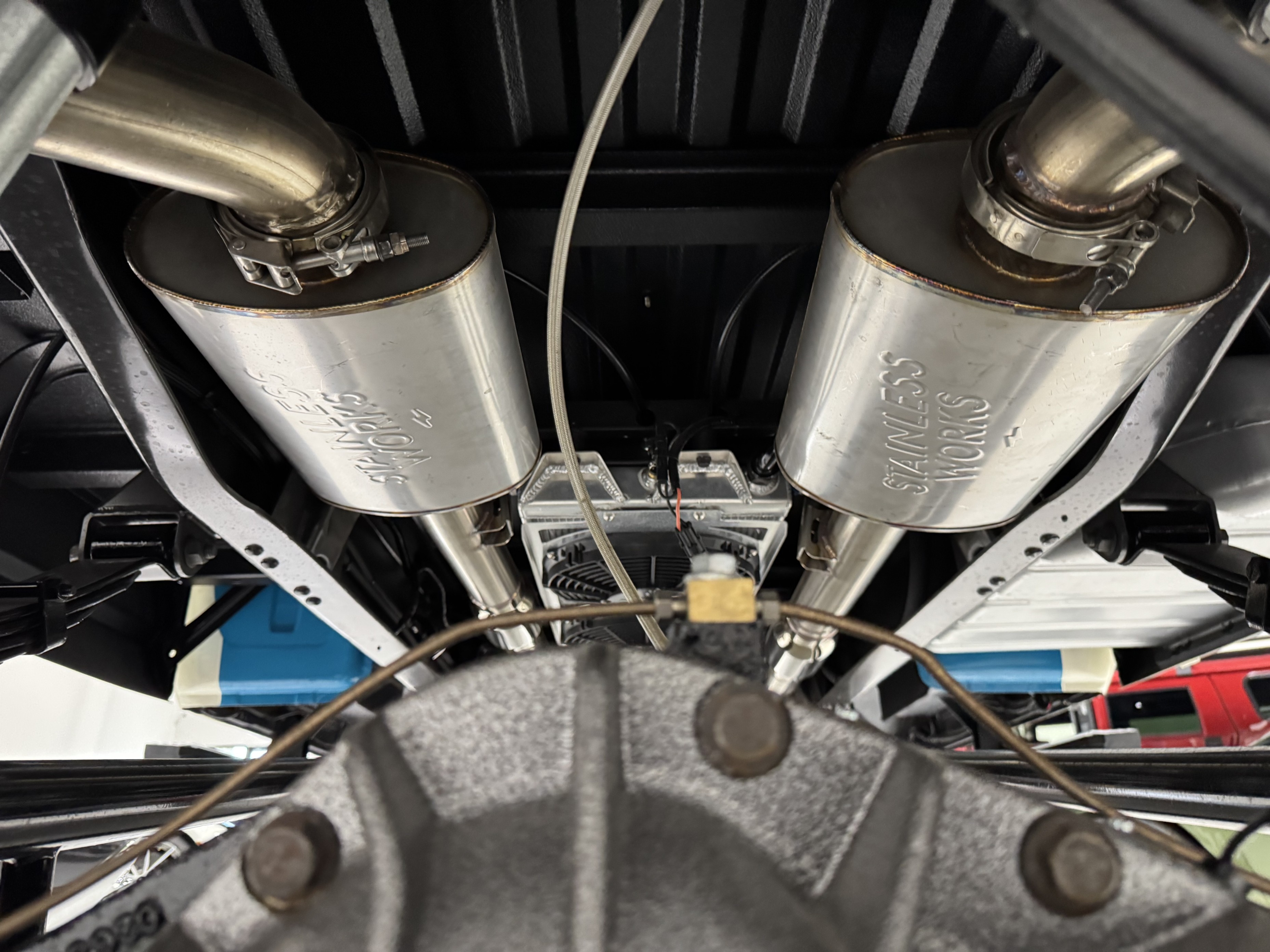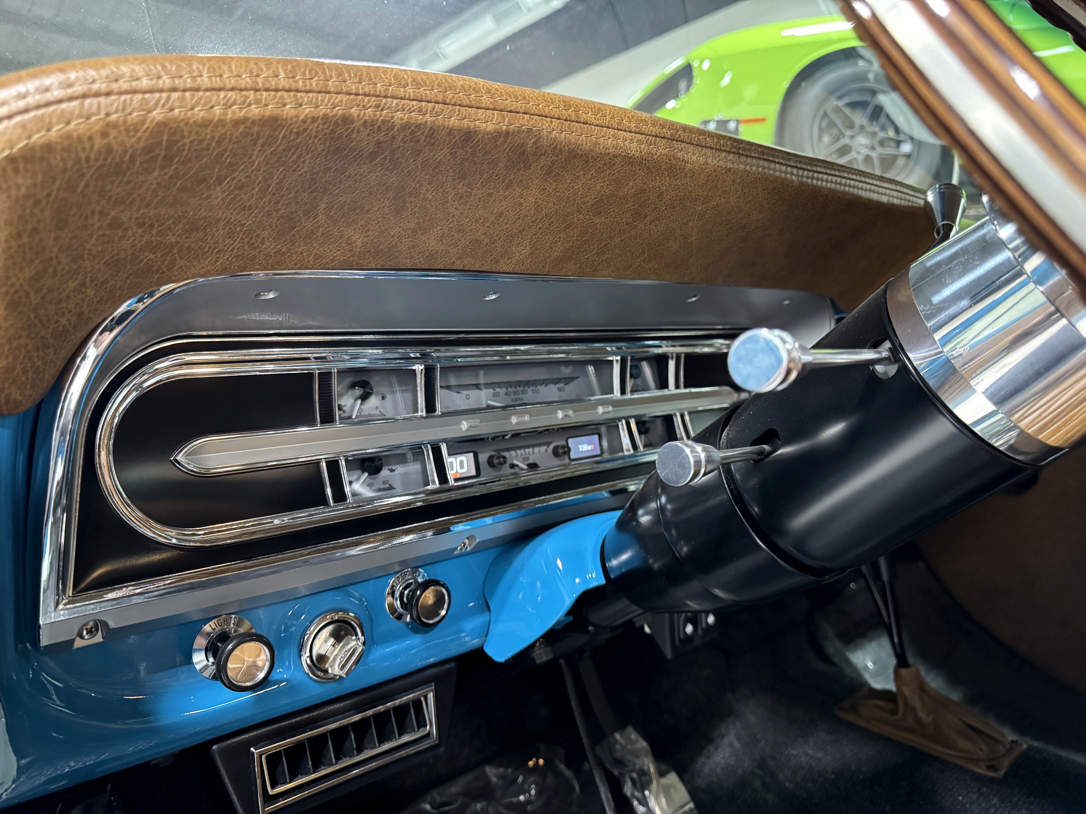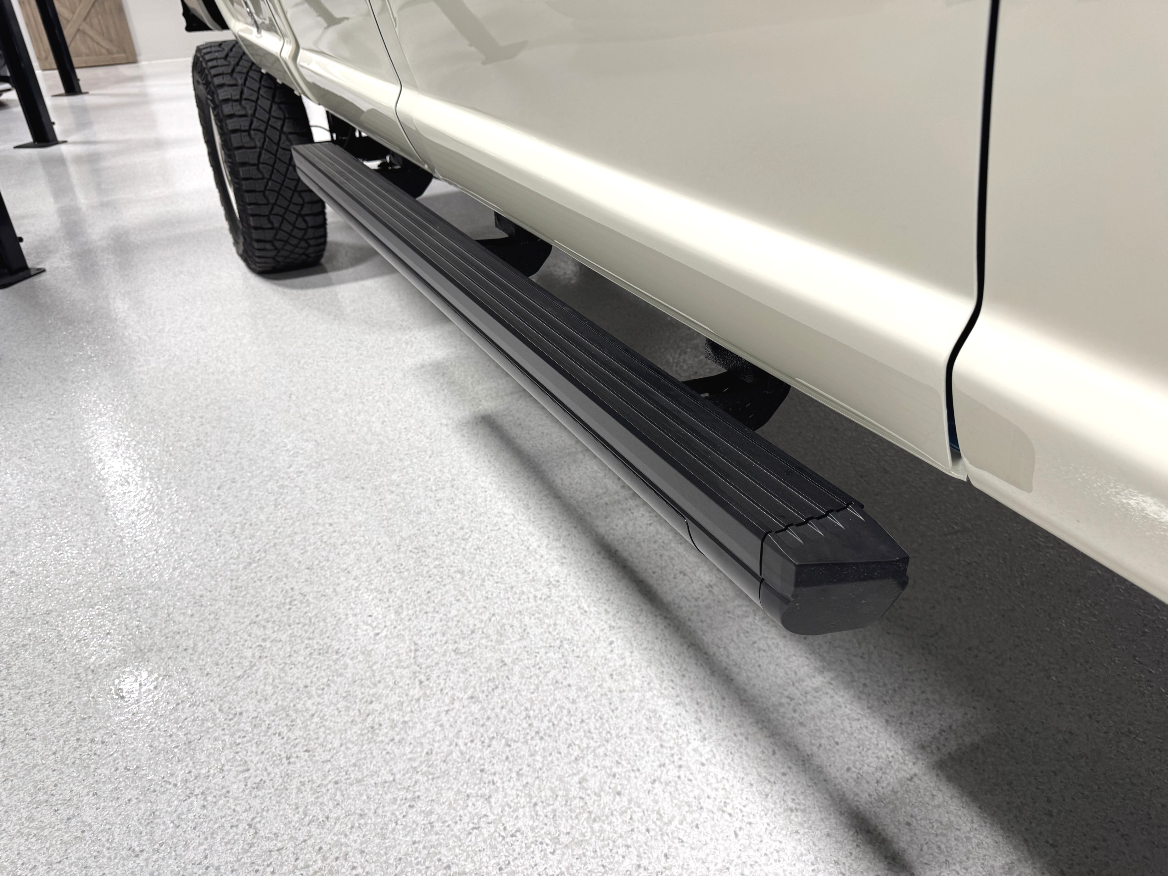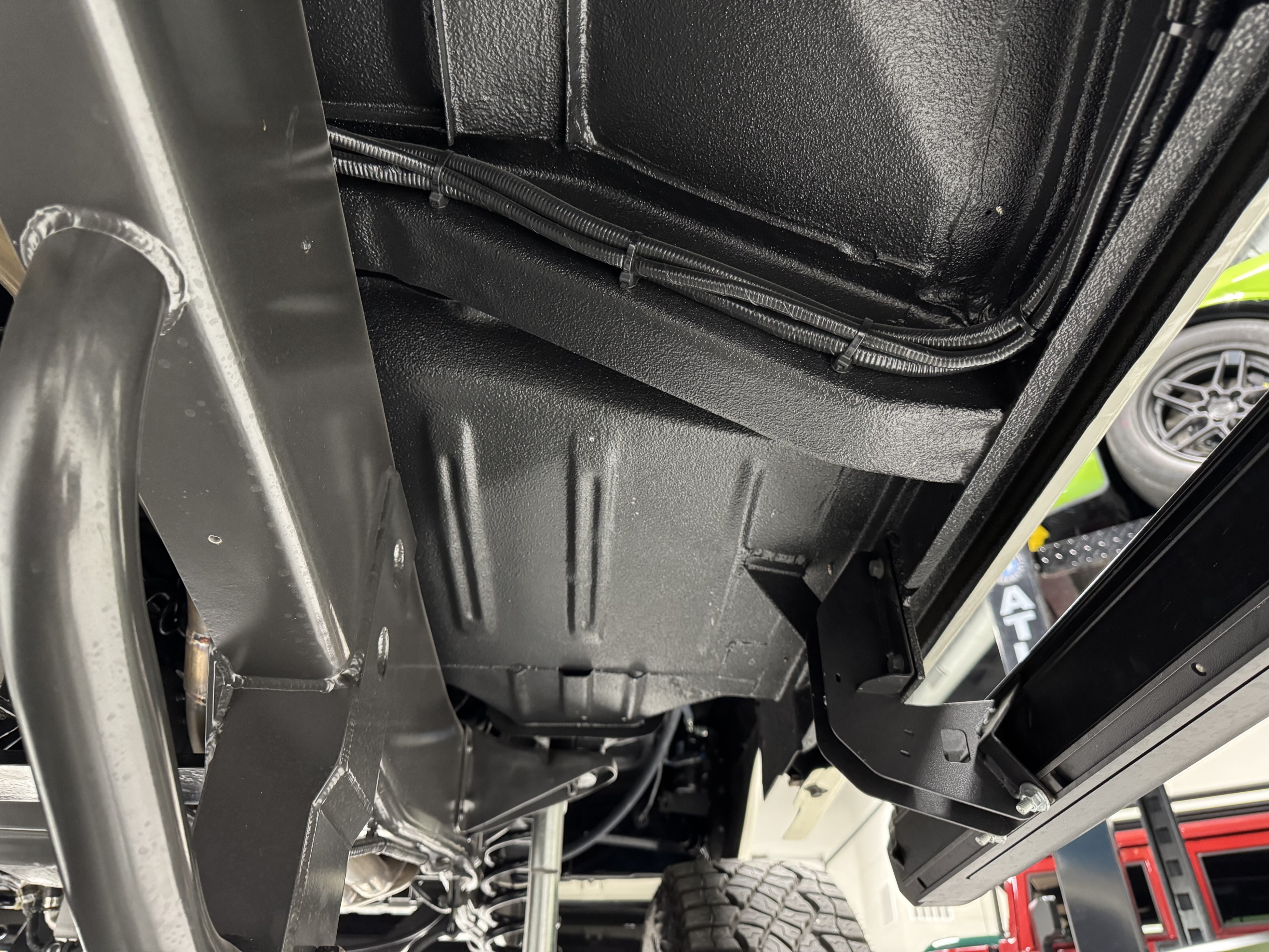 Additional features include Eaton ELocker front and rear differentials, Dana axles, power side steps, Hydroboost power brake assist, Wilwood four-wheel disc brakes, a suspension lift, Bilstein shock absorbers, a four-link rear suspension system, and Detroit Steel Wheels. Fueltech FT550 ECU, Shelby-style wood steering wheel, Dakota digital instrumentation, and a retro-style digital / bluetooth stereo. Vintage Air and power windows. This was a $402K custom build by Gateway Bronco.