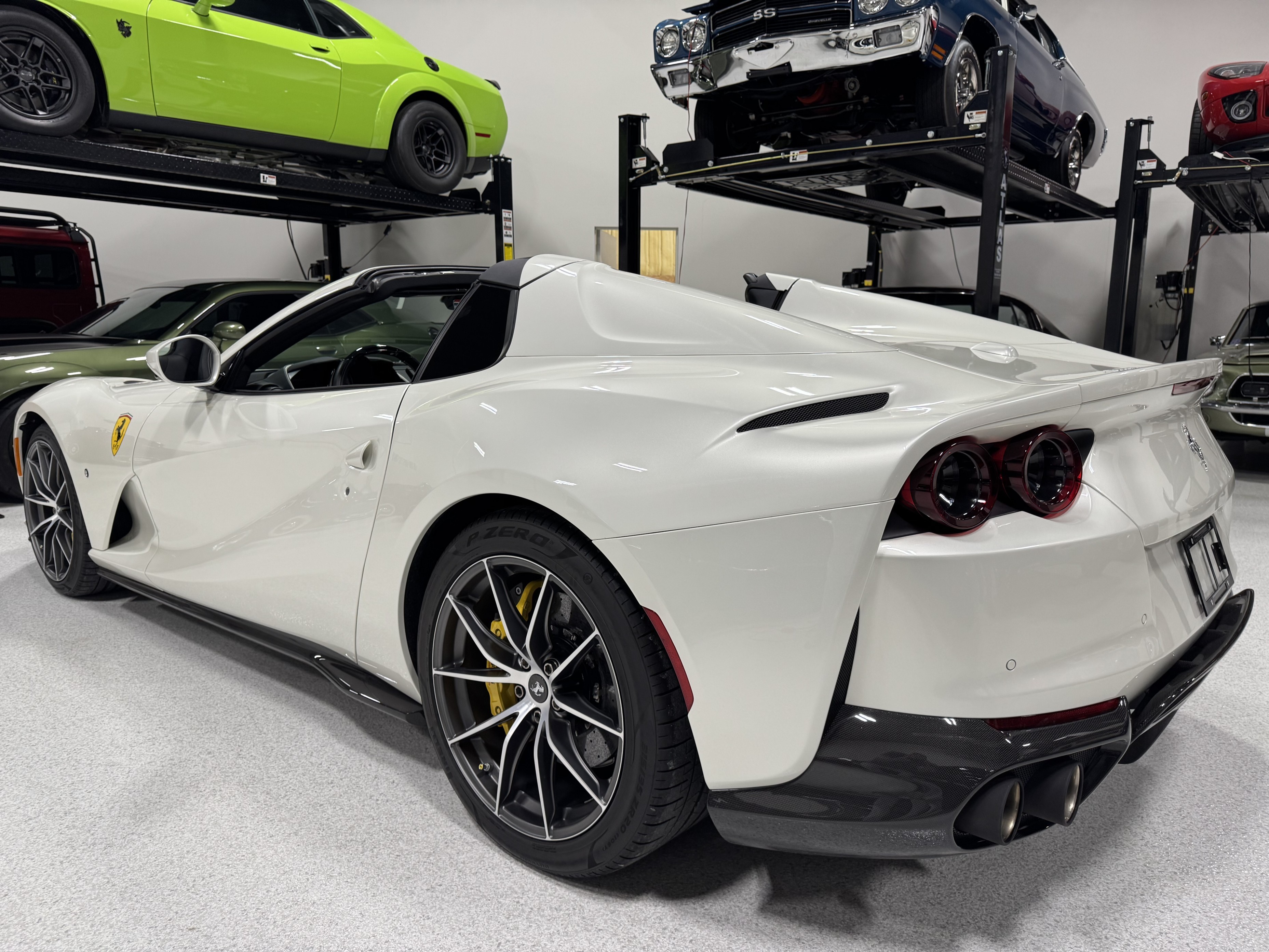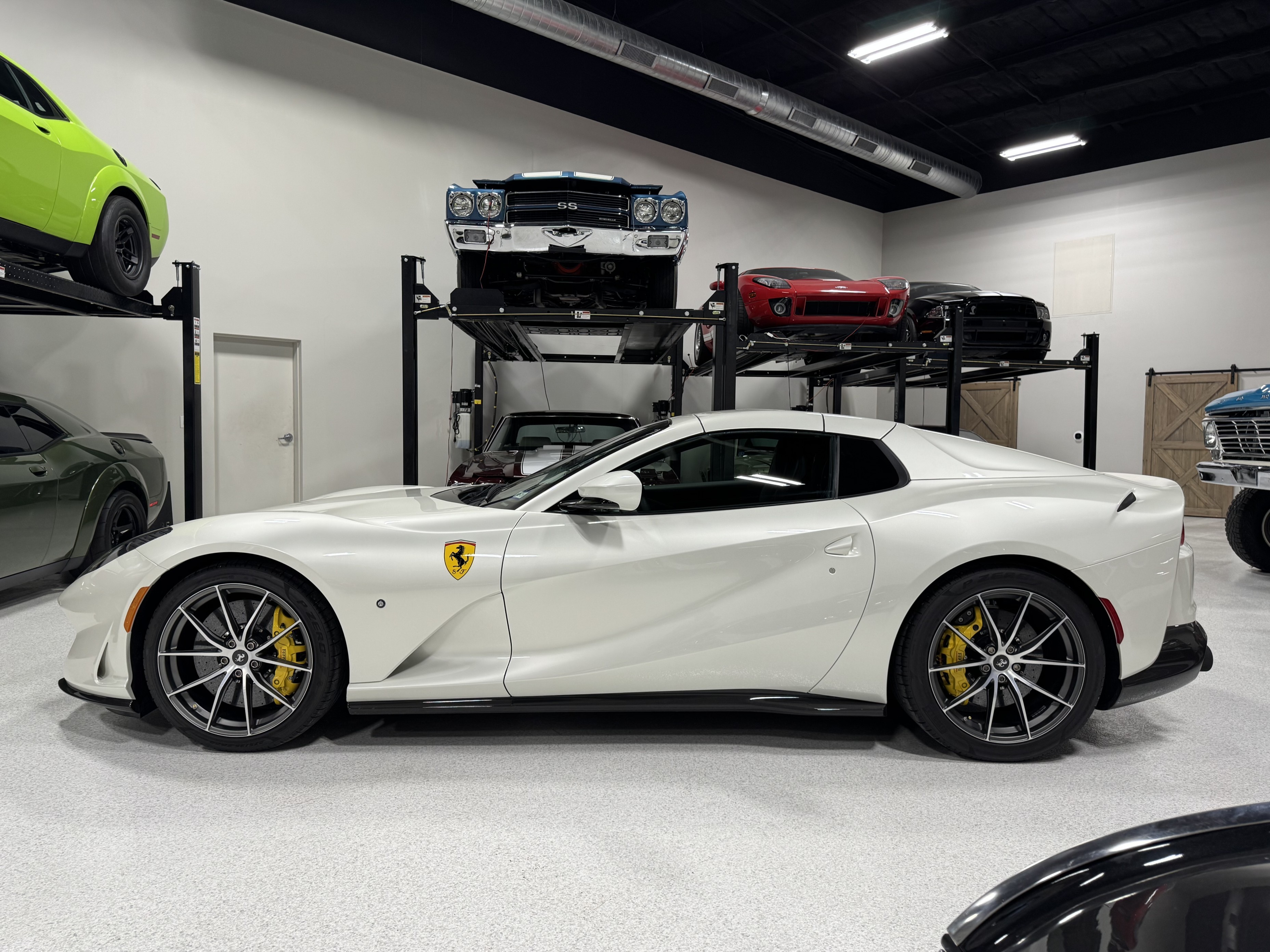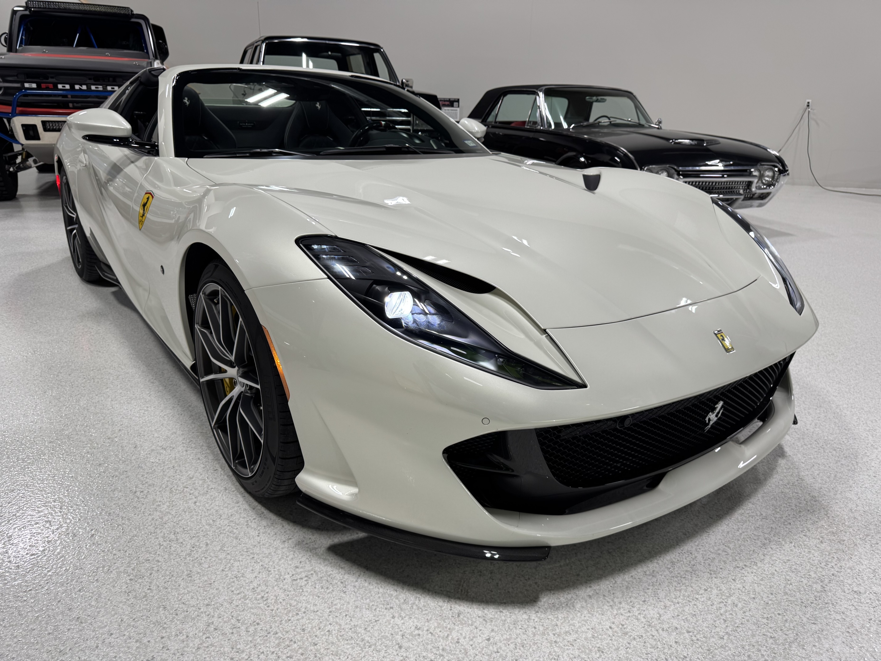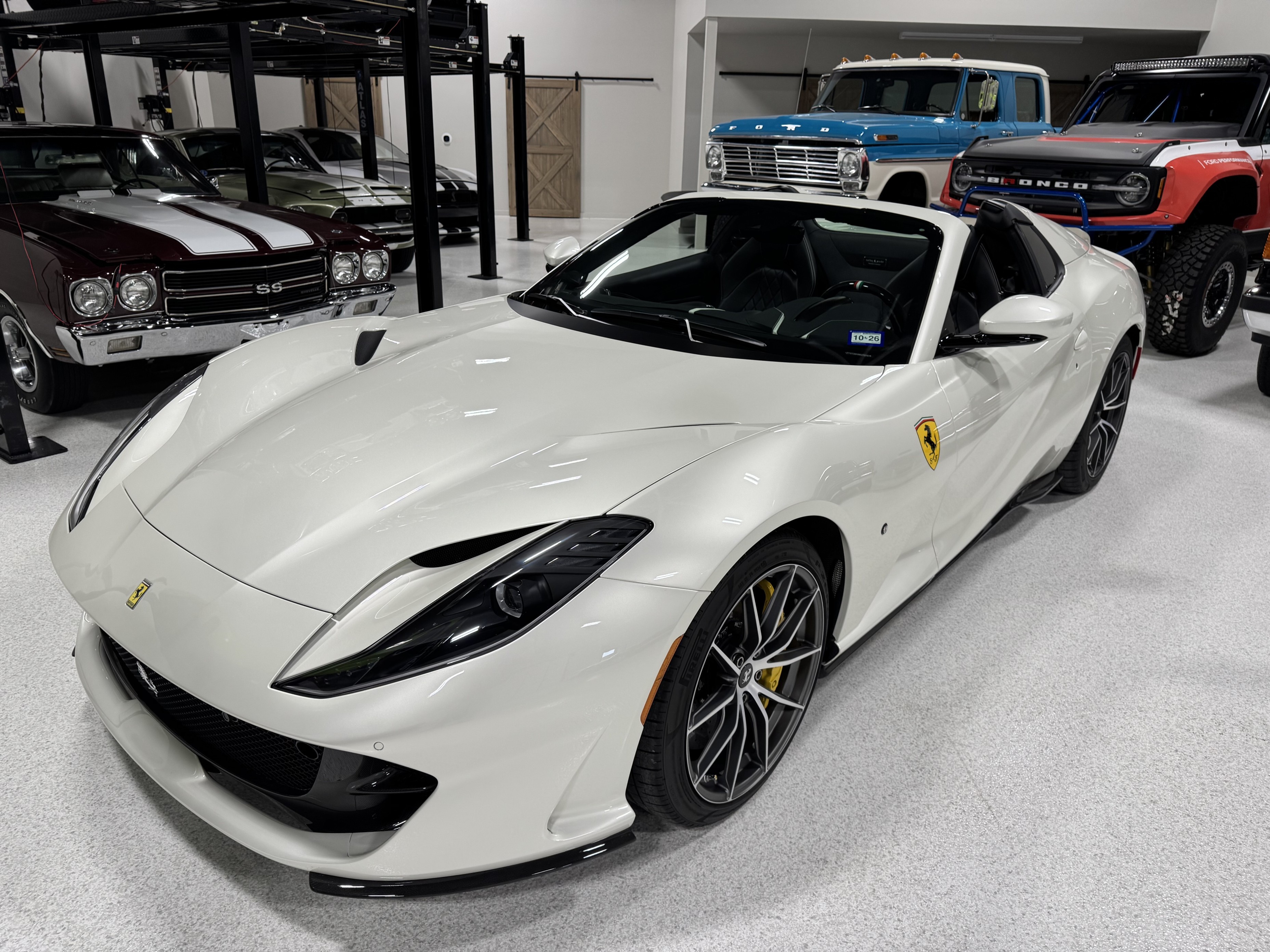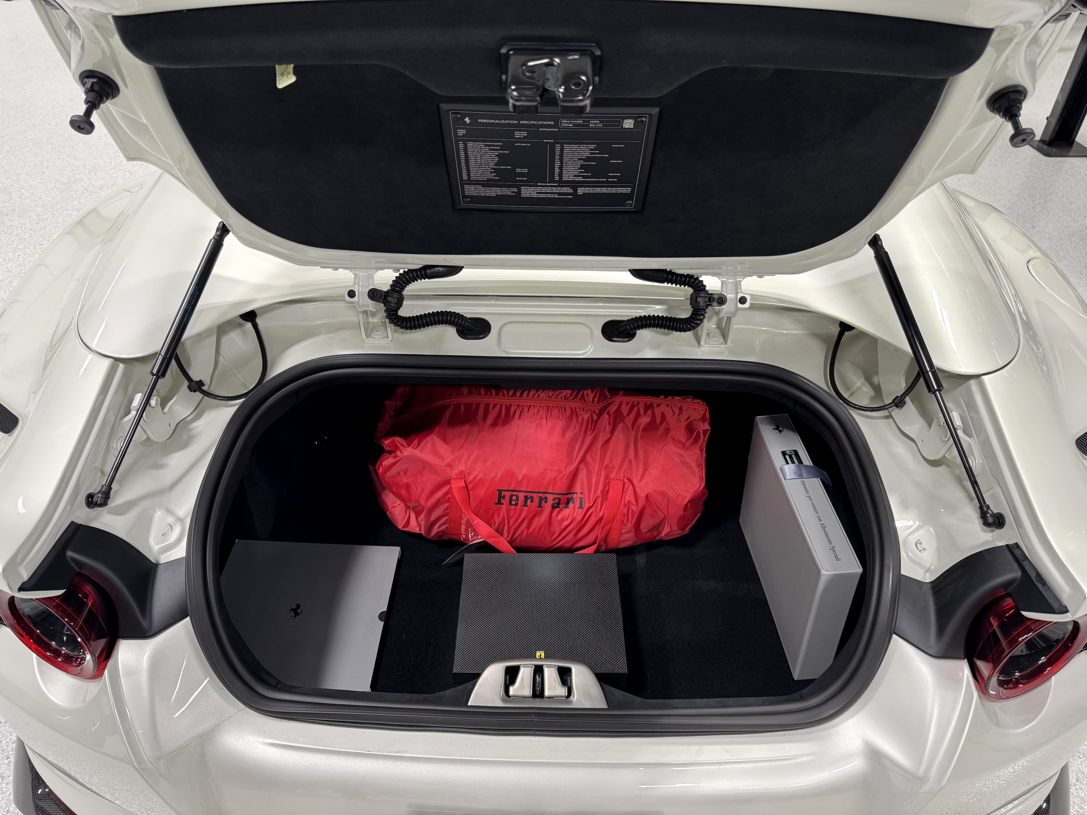 This 812GTS was an exclusive order from Ferrari's Taylor-Made program. **$592,901 BUILD** Color is: Extra Range Bianco Italia. $188K OPTIONS. **Airbrushed Scuderia Ferrari fender shields: $14k option.** All service/maintenance complete and up-to-date @ BOARDWALK FERRARI. No picks / No paintwork / Mint Condition. Nonsmoker. Powered by a 6.5-liter F140 V12 mated to a seven-speed F1 dual-clutch automatic transaxle and Ferrari’s E-Diff limited-slip differential, the car has black leather upholstery, an electronically operated hardtop, 20″ ten-spoke racing alloy wheels, four-wheel steering, front and rear cameras and parking sensors, airbrushed Scuderia Ferrari fender shields, carbon-fiber exterior and interior accents, heated power-adjustable bucket seats, navigation, and a JBL Professional Hi-Fi sound system. Exterior details include an electronically operated hardtop, LED headlights and tail lights, front and rear cameras, carbon-fiber accents, rear fog lights, parking sensors, and quad exhaust outlets. Paint protection film has been applied to the body, which has also received a ceramic coating. The 20″ ten-spoke racing alloy wheels are mounted with 275/35 front and 315/35 rear Pirelli P Zero tires. Stopping power is provided by Ferrari-branded yellow calipers over cross-drilled carbon-ceramic rotors. The car is equipped with a Virtual Short Wheelbase four-wheel-steering system and a magnetorheological suspension. No surprises. This was not an auction or trade-in, we know and consigned for the original owner and now the 2nd owner.
